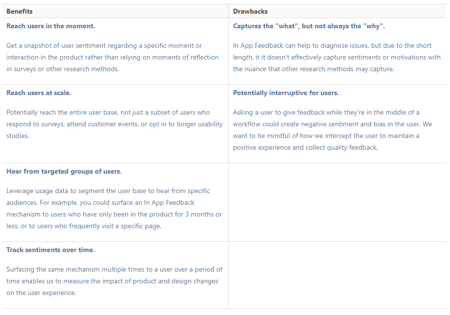 System Initiated Mechanisms: Feedback mechanisms initiated by the system are generally reserved for high business impact research questions as they are more interruptive for users. System initiated mechanisms can leverage data to segment the user base and hear from specific audiences. These mechanisms generally do not persist in the experience. Once triggered, a user has the opportunity to provide feedback or may ignore or close the mechanism.